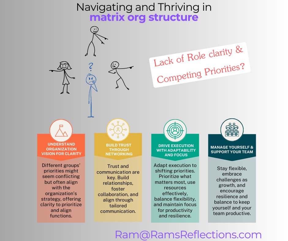 Thriving in a matrix organization requires clarity, trust, adaptability, and resilience. Aligning with organizationโs vision, building strong connections, executing with focus, and supporting our teams, can turn complexity into growth.